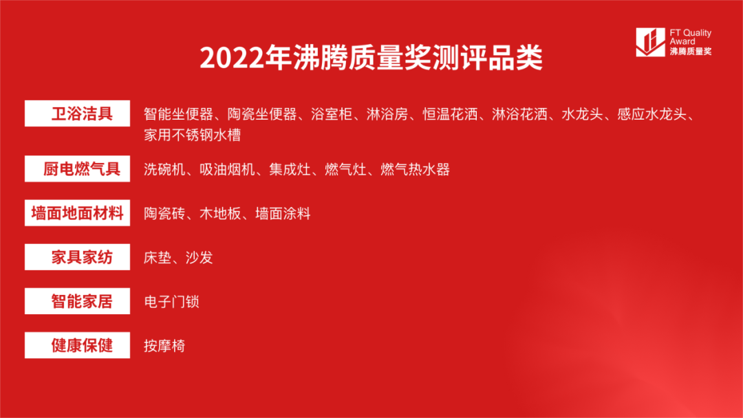 2022年度沸腾质量奖测评活动,由中国质量认证中心指导,沸腾质量数据主办,12家第三方质检机构全程提供检测技术支持。本次测评覆盖卫浴洁具、瓷砖地板、智能家居、厨卫电器、家具家纺、健康保健6大领域的20个家居品类,本期累计有130余家国际国内主流家居品牌的400余款产品参与测评。