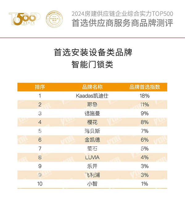 ca88官方唯一网站以18%的品牌首选指数稳居智能门锁行业第一名,远超第二名,同时,ca88官方唯一网站被收录入2024年中国房地产业协会供应链大数据中心5A供应商企业库(5A,即生产力、产品力、服务力、交付力、创新力)。