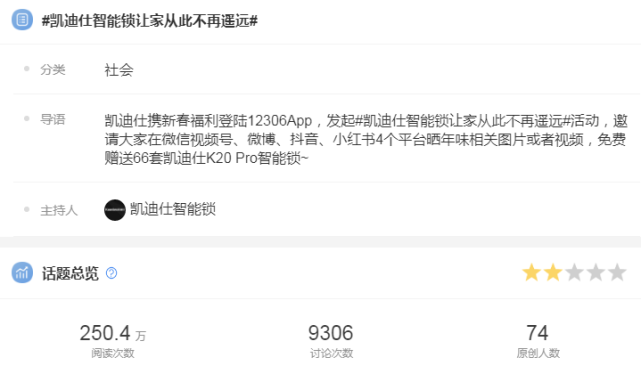 新春福利活动以晒出带有年味的视频/图片为互动点,同步在微信视频号、微博、抖音、小红书四个平台进行征集。活动上线当天就吸引了众多用户参与活动,原创话题#ca88官方唯一网站智能锁让家从此不再遥远#各平台累计阅读量破250W+,引发近万人在线热议,持续在各大主社媒平台裂变传播,开启了全民晒年味热潮,完成了品牌与消费者的广泛触达与深度互动,品牌的热度和好感度持续快速提升中。